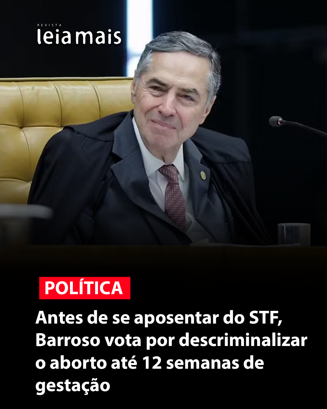 - 18 OutAntes de se aposentar do STF, Barroso vota por descriminalizar o aborto até 12 semanas de gestaçãoLEIA MAIS